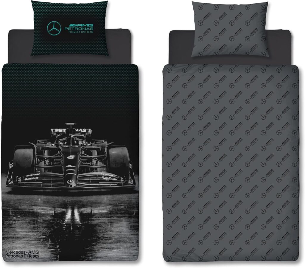 OFFICIEEL PRODUCT: Officieel gelicentieerd door Mercedes Formule 1 Team, deze beddengoedset bevat een eenpersoonsbed dekbedovertrek en kussensloop, en is voorzien van de Mercedes AMG Petronas F1 Team autoOmkeerbaar: Verfris…