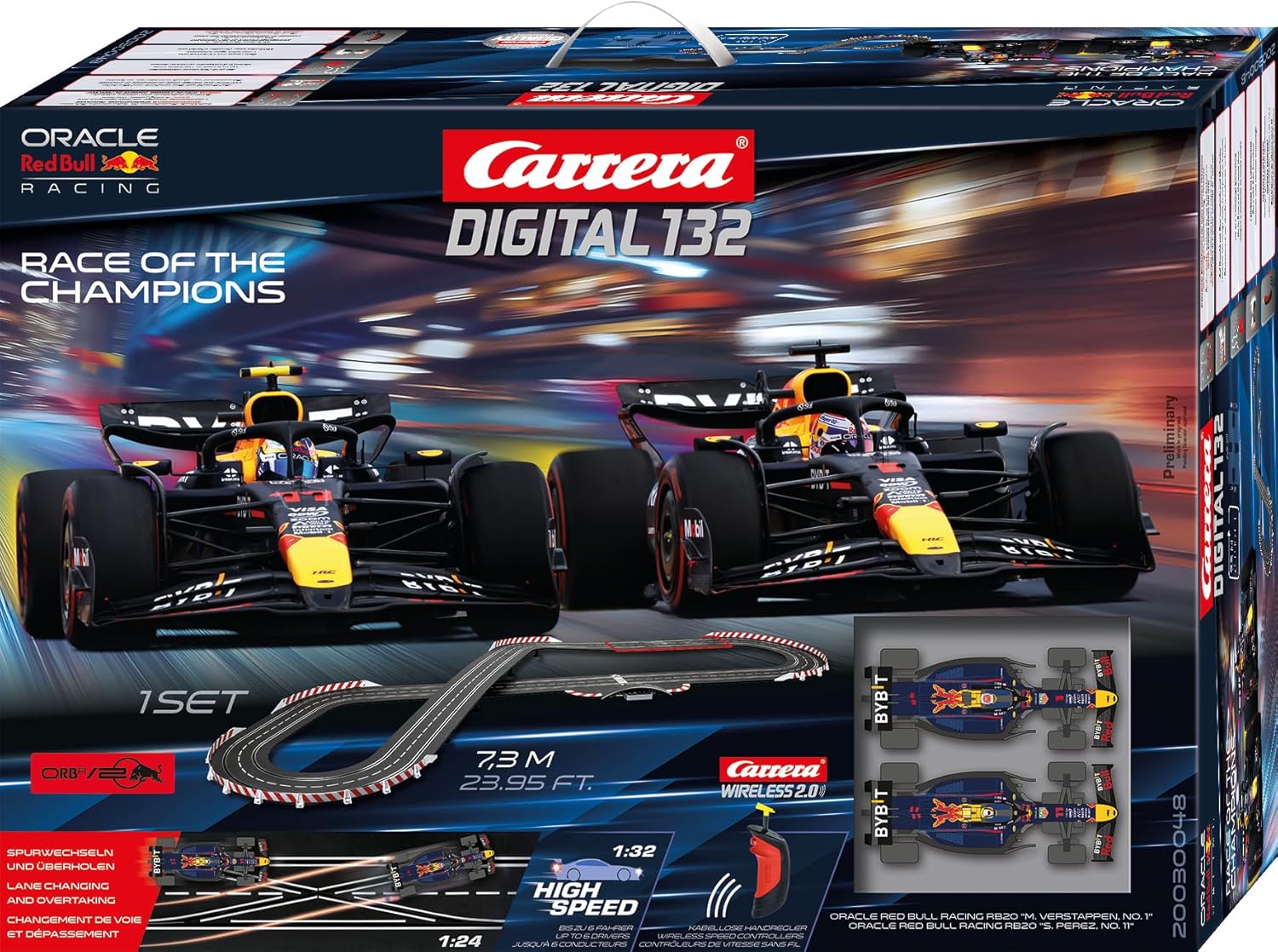 Beleef dichtbij: de Formule 1-duel tussen verstappen en Pérez Met de Carrera DIGITAL 132 Race of the Champions set kunnen fans de spannende racemomenten tussen Max Verstappen en Sergio Perez uit het Formule 1-seizoen 2024 van dichtbij in hun eigen vier muren beleven. Op de 7,3 meter lange afstand komen de gedetailleerde Red Bull Racing RB20 M. Verstappen, No.1 en S. Perez, No.11 in actievolle kop-op-hoofd-duellen met elkaar samen. Dankzij de draadloze 2.0 handregelaars ervaren racepiloten maximale vrijheid en nauwkeurige bediening. Tot 6 bestuurders tegelijkertijd vechten hier om de ruimte op de trap – avonturen gegarandeerd. De sensatie om elke seconde op de baan te vechten en de spanning van een echte Formule 1-race wordt tastbaar – ook zonder in een cockpit te zitten. Een must voor alle Formule 1-fans die de rivaliteit tussen verstappen en Perez van dichtbij willen ervaren.