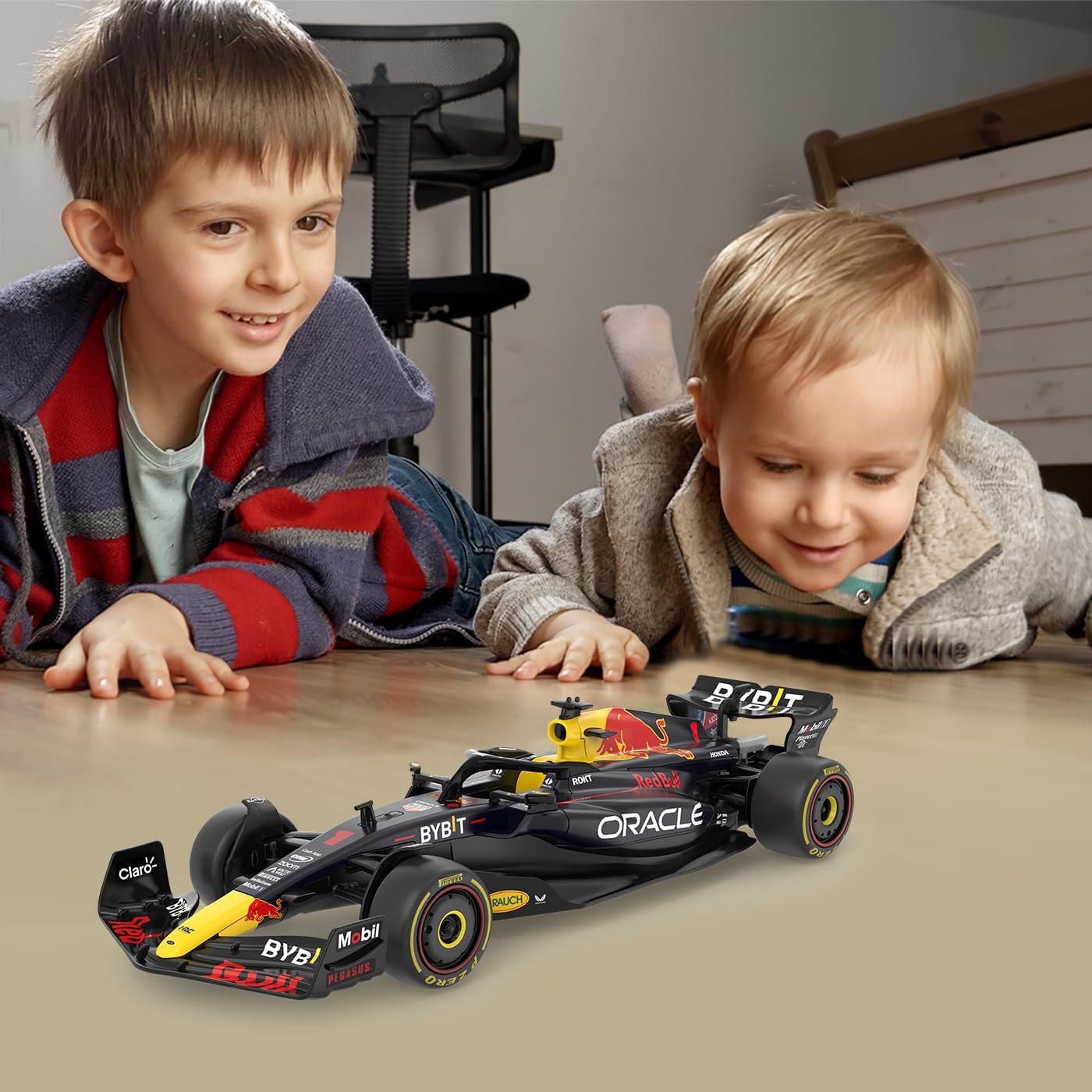 Op de motorafdekking en de voertuigas vind je nog meer accenten in het typische geel/rode Red Bull design. De droom om zo’n wagen van dichtbij te ervaren kan nu uitkomen